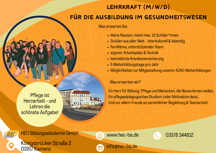 Über uns: Die HEC ist seit 1991 ein anerkannter Bildungsträger in den Bundesländern Sachsen und Brandenburg. Wir bilden vorrangig an unseren Staatlich anerkannten Fachschulen für Sozialwesen bzw. Berufsfachschulen in sozialpflegerischen und sozialpädagogischen Berufen mit staatlicher Anerkennung aus.